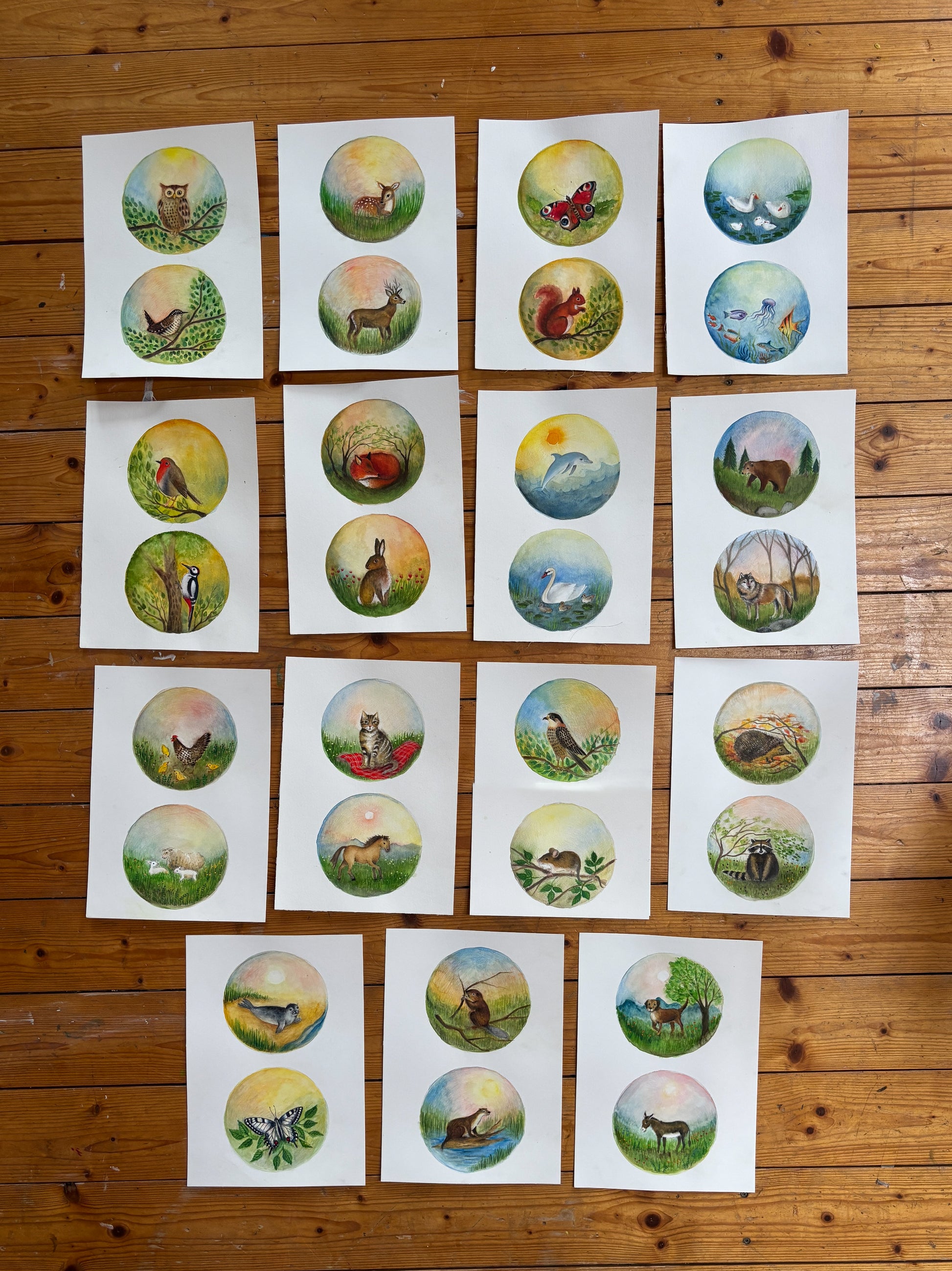 Alle 32 Tiermotive, wunderschön gestaltet mit Aquarell und Buntstiften.